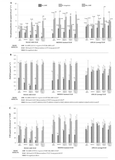 Effects of AMF inoculation on net photosynthesis rate (A), quantum efficiency in light (B), and electron transport rate (C) in the grapevine leaves of different maturity infected with GRSPaV, GLRaV3 and/or GPGV viruses. Parameters were analyzed by three-way ANOVA and statistically significant differences in main effects are indicated by distinct uppercase letters. Distinct lowercase letters represent statistically significant difference (p < 0.05), made with Bonferroni post-hoc test.