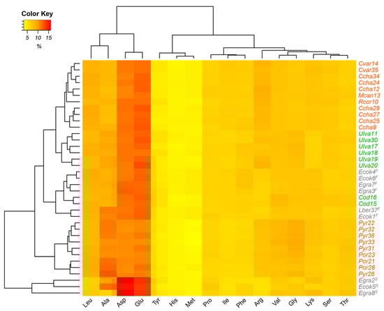 Regarding the essential amino acid index (EAAI), the highest average percentages corresponded to Ulvales, Laminariales, Gigartinales, and Rhodymeniales (EAAI > 0.92), while the lowest percentages corresponded to Bryopsidales and Bangiales (0.90 > EAAI > 0.88,