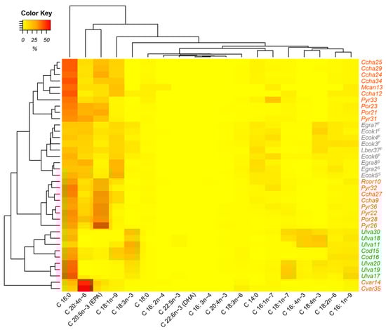 67]. Finally, red algae from Gigartinales and Bangiales have significant relative percentages of C16:0 (30–64%), EPA (6–42%), and C20:4n − 6 (1–17%) for