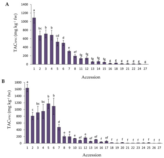 Variation for root total anthocyanin content, estimated by spectrophotometry (TACSPEC), among 27 purple-rooted carrot accessions, in 2018 (A) and 2019 (B). Accession numbers refer to the carrot materials described in Table 1 and are presented in decreasing order according to their total anthocyanin content, as evaluated by HPLC analysis in 2018. Bars indicate mean values of three replicates, expressed as mg of cyanidin equivalents per kg of fresh weight (mg kg−1 fw) ± standard error. Mean values with a common letter are not significantly different at p ≤ 0.05 (LSD Fisher test).