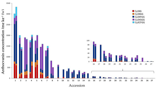 Root anthocyanin composition in 27 purple carrot accessions. For each accession, the left and right bars indicate carrots grown in 2018 and 2019, respectively. Accession numbers refer to the carrot materials described in Table 1 and are presented in decreasing order according to their total anthocyanin content, as evaluated by HPLC analysis in 2018. Bars for total anthocyanin concentration content were partitioned into their mean content of individual anthocyanin pigments, expressed as mg kg−1 fw. The sub-figure in the bottom right depicts anthocyanin profiles in accessions with less than 150 mg/kg fw of total anthocyanins. Acylated and non-acylated anthocyanins are indicated in cold (light blue, violet, and dark blue) and warm colors (red and orange), respectively. Cy3XG. Cyanidin-3-(2″-xylose-galactoside); Cy3XGG. Cyanidin-3-(2″-xylose-6-glucose-galactoside); Cy3XFGG. Cyanidin-3-(2″-xylose-6″-feruloyl-glucose-galactoside); Cy3XSGG. Cyanidin-3-(2″-xylose-6″-sinapoyl-glucose-galactoside); Cy3XCGG. Cyanidin-3-(2″-xylose-6″-(4-coumaroyl)glucose-galactoside).