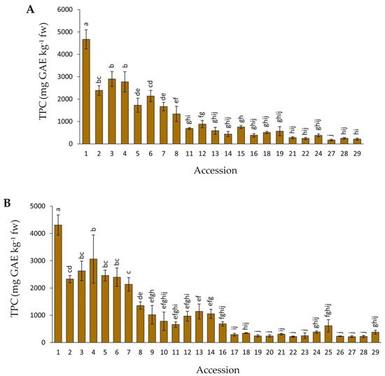 Root total phenolics content (TPC) for carrot accessions grown in 2018 (A) and 2019 (B). Accession numbers refer to the carrot materials described in Table 1. Bars indicate mean values of three replicates, expressed as mg of gallic acid equivalents (GAE) per kg of fresh weight (mg GAE kg−1 fw) ± standard error. Mean values with a common letter are not significantly different at p ≤ 0.05 (LSD Fisher test).