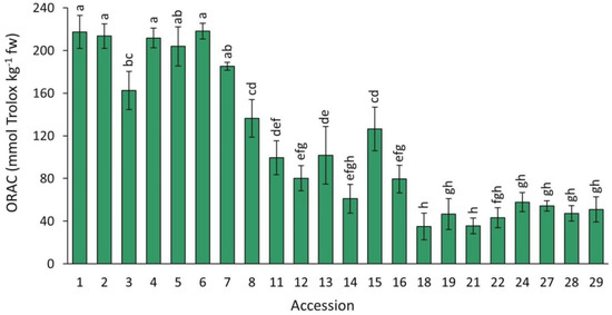 Antioxidant capacity by ORAC in carrot accessions grown in 2018. Accession numbers refer to the carrot materials described in Table 1. Bars indicate mean values of three replicates, expressed as mmol Trolox kg−1 fw ± SE. Mean values with a common letter are not significantly different at p ≤ 0.05 (LSD Fisher test).