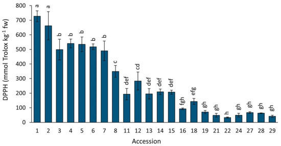 Antioxidant capacity by DPPH in carrot accessions grown in 2018. Accession numbers refer to the carrot materials described in Table 1. Bars indicate mean values of three replicates, expressed as mmol Trolox kg−1 fw ± SE. Mean values with a common letter are not significantly different at p ≤ 0.05 (LSD Fisher test).
