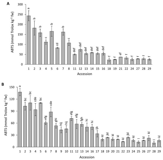 Antioxidant capacity by ABTS in carrot accessions grown in 2018 (A) and 2019 (B). Accession numbers refer to the carrot materials described in Table 1. Bars indicate mean values of three replicates, expressed as mmol Trolox kg−1 fw ± SE. Mean values with a common letter are not significantly different at p ≤ 0.05 (LSD Fisher test).
