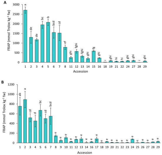 Antioxidant capacity by FRAP in carrot accessions grown in 2018 (A) and 2019 (B). Accession numbers refer to the carrot materials described in Table 1. Bars indicate mean values of three replicates, expressed as mmol Trolox kg−1 fw ± SE. Mean values with a common letter are not significantly different at p ≤ 0.05 (LSD Fisher test).
