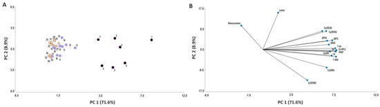 Score plot (A) and loading plot (B) of the principal component analysis (PCA) for 12 phytochemicals [five anthocyanin pigments (Cy3XG, Cy3XGG, Cy3XSGG, Cy3XFGG, and Cy3XCGG), total acylated anthocyanins (TAA), total non-acylated anthocyanins (TNAA), total anthocyanin content by HPLC (TA HPLC), total anthocyanins by spectrophotometry (TA), total phenolics (TPC), β-carotene, and lutein] and antioxidant capacity estimated by four analytical methods (ABTS, FRAP, DPPH, and ORAC), for 29 carrot accessions. Data from years 2018 and 2019 were combined. The numbers of the accessions in the score plot refer to the carrot materials described in Table 1, indicating with black, violet, and orange circles accessions with high (>1000 mg kg−1 fw), intermediate (80–1000 mg kg−1 fw), and low anthocyanin content (<80 mg kg−1 fw), respectively. In the loading plot, the lines starting from the center point of the bi-plot depict the positive or negative association of the parameters with the two principal components.
