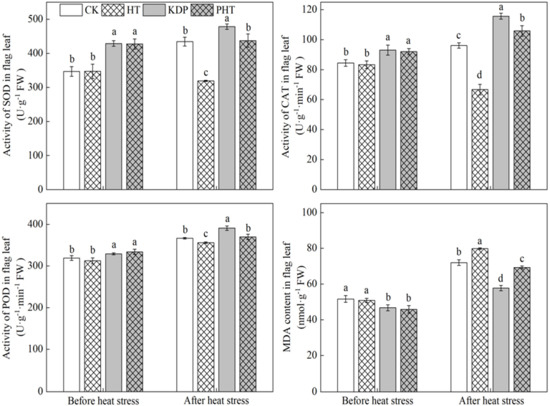 3.2. Effects of Spraying KH2PO4 on the Antioxidant Enzyme Activity of Wheat Flag Leaves under Heat Stress during the Filling Period