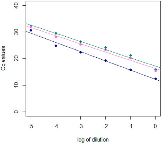 This graph highlights the efficiency-curve comparison. The horizontal axis reports the logarithm of the dilution factor, while the vertical axis shows the Cq values obtained in the reactions. In blue are the points and the interpolating line of the dRT-qPCR (slope = −3.41; R2 = 98%); in green are the points and the interpolating line of the sRT-qPCR by Luigi and Faggioli [8] (slope = −3.10; R2 = 99%); and in purple are the points and the interpolating line of the sRT-qPCR by Serra et al. [4] (slope = −3.10; R2 = 98%).