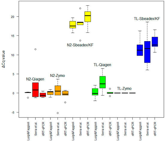 ΔCq values of amplifications using three different real-time PCR tests: Luigi and Faggioli [8], Serra et al. [4] and the dRT-qPCR developed in this work. Each test was applied to six different classic extraction protocols: liquid nitrogen (N2) + RNeasy Plant mini-kit (Qiagen)—red; liquid nitrogen (N2) + Quick-RNA Plant Kit (Zymo)—orange; liquid nitrogen (N2) + Sbeadex maxi-plant kit (Sbeadex/KF)—yellow; Tissue Lyser (TL) + RNeasy Plant mini-kit (Qiagen)—green; Tissue Lyser (TL) + Quick-RNA Plant Kit (Zymo)—purple; and Tissue Lyser (TL) + Sbeadex maxi-plant kit (Sbeadex/TL)—blue. Cq values were normalized (ΔCq) using the Tissue Lyser (TL) + Quick-RNA Plant Kit (Zymo) as a benchmark. Values are expressed as boxplots of six PLMVd-infected plants (two technical replicates).