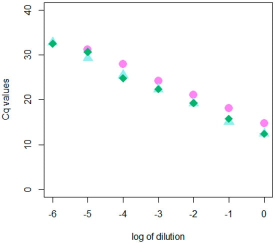 The dRT-qPCR was validated according to EPPO standard PM 7/98 [12]. Analytical sensitivity was assessed using three positive samples diluted tenfold in the total RNA of a healthy peach. The Limit of Detection (LOD) was assessed at a dilution of 10−5, which represents the last dilution in which all three samples gave positive Cq values (30 ± 1) [12] (Figure 4).