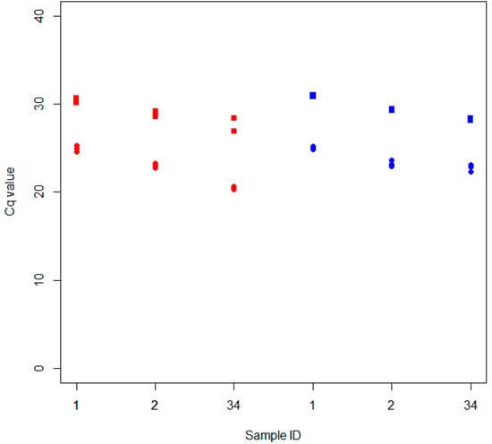 Cq values obtained by testing the repeatability (red) and reproducibility (blue) of the dRT-qPCR. Samples were tested at low (■) and medium (●) concentrations, each in three technical replicates.