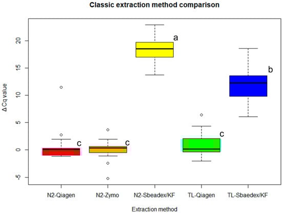 Comparison of the mean ΔCq values obtained in analyzing TRNA extracted with the following combinations: liquid nitrogen + RNeasy Plant mini-kit—red; liquid nitrogen + Quick-RNA Plant Kit—orange; liquid nitrogen + Sbeadex maxi-plant kit—yellow; Tissue Lyser + RNeasy Plant mini-kit—green; Tissue Lyser + Sbeadex maxi-plant kit—blue. Statistical significance of differences was determined using Tukey’s HSD post hoc test; different letters indicate statistically different groups (p < 0.001).