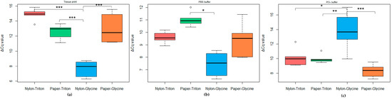 Boxplot reporting the ΔCq values obtained in analysis of TRNA from rapid extraction: (a) results obtained in analysis of tissue-printed samples; (b) results obtained in analysis of samples macerated in PBS buffer; and (c) results obtained in analysis of samples macerated in PO4 buffer. Statistical significance of different ΔCq values was determined using Tukey’s HSD post hoc test (* = p < 0.05; ** = p < 0.01; *** = p < 0.001).