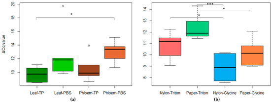 (a) Boxplot reporting the ΔCq values obtained in analysis of leaf samples vs phloem samples through tissue printing (TP) or maceration in PBS (PBS). (b) Comparison of the ΔCq values of the leaf samples macerated in Bioreba buffer, spotted on nylon or paper membranes and released with Triton or glycine buffer. Statistical significance of differences was determined using Tukey’s HSD post hoc test (* = p < 0.05; *** = p < 0.001).