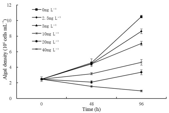 After exposing different concentrations of quercetin, algal density was counted through the use of a hemocytometer (XB-K-25) every 48 h with an optical microscope (OPTIKA, B-1000PH, Ponteranica, Italy). The relative inhibitory rate (IR) was calculated as shown in Equation (1) [62]: