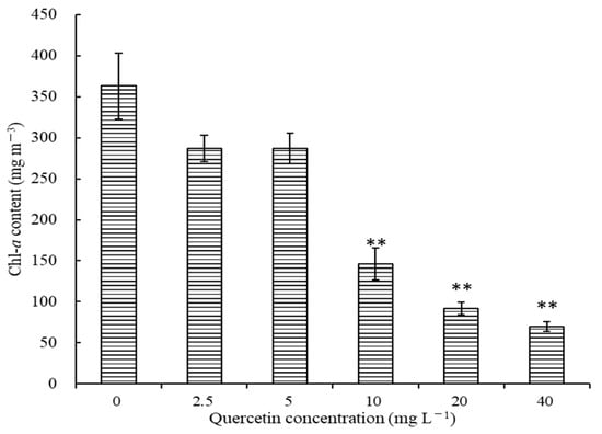 Effects of different quercetin concentrations on chl-a of M. aeruginosa at 96 h. The group without quercetin was used as the control. ** p < 0.01 indicates highly significant differences compared to the corresponding controls.