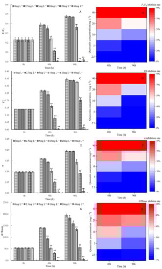 Maximum quantum yield Fv/Fm and its inhibition rate (A,B), the efficiency of photosystem II YII and its inhibition rate (C,D), alpha and its inhibition rate (E,F), rETRmax and its inhibition rate (G,H) of M. aeruginosa exposed to different levels of quercetin. The group without quercetin was used as the control. * p < 0.05 and ** p < 0.01 indicate significant and highly significant differences in comparison with the corresponding controls.
