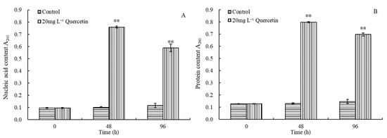 Effects of 20 mg L−1 quercetin on nucleic acid (A) and protein (B) content of M. aeruginosa. The group without quercetin was used as the control. ** p < 0.01 indicates highly significant differences in comparison with the corresponding controls.