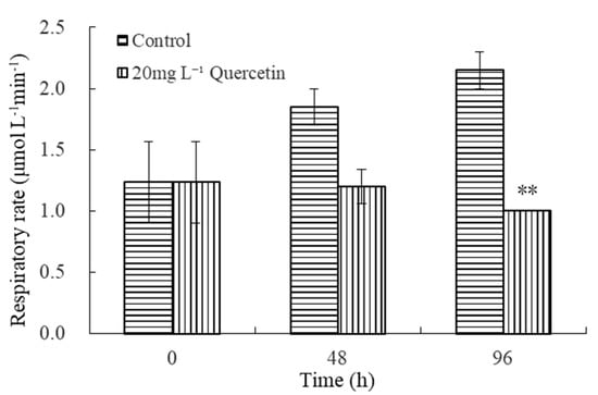 Effects of 20 mg L−1 quercetin on respiratory rate of M. aeruginosa. The group without quercetin was used as the control. ** p < 0.01 indicates highly significant differences in comparison with the corresponding controls.