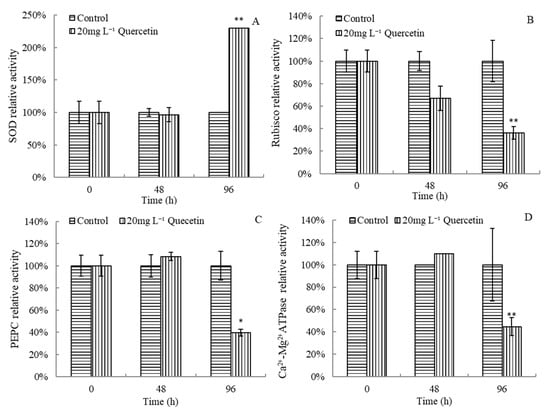 Effects of quercetin on SOD (A), Rubisco (B), PEPC (C), and Ca2+-Mg2+ATPase (D) relative activities of M. aeruginosa. * p < 0.05 and ** p < 0.01 indicate significant and highly significant differences compared with the corresponding controls.