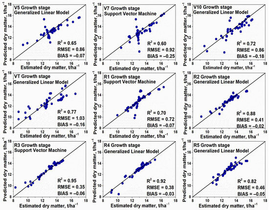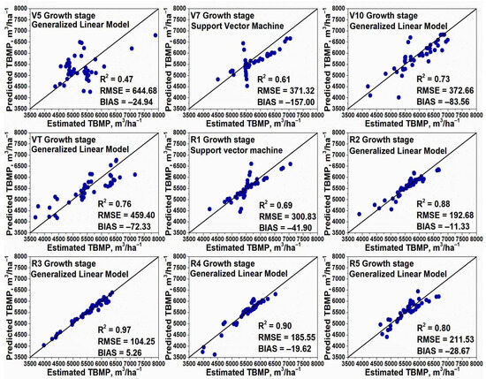 The performance results of the highest performing model in predicting maize TBMP values among GLM, SVM, and RF are shown in Figure 2 at nine growth and development stages.