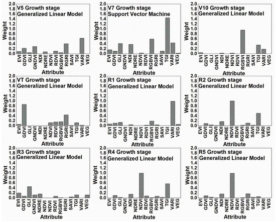 The weights of the attributes which reflect the relative importance of the 14 VI used in this study for maize TBMP prediction are shown in Figure 4, according to the models shown in Figure 2.