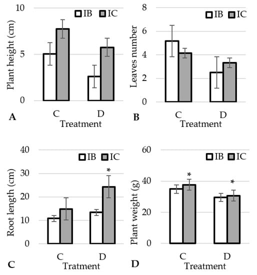 Effect of treatments on plant height (A), number of leaves (B), root length (C) and plant weight (D) in garlic ecotypes. *-significant differences (p < 0.05) among the ecotype within each treatment. IB: Istarski bijeli, IC: ’Istarski crveni’, C: control, D: drought.