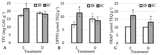 Effect of treatments on TPC (A), DPPH (B) and FRAP (C) in garlic ecotypes. * significant differences (p < 0.05) among the ecotype within each treatment. IB: Istarski bijeli, IC: ‘Istarski crveni’, C: control, D: drought.