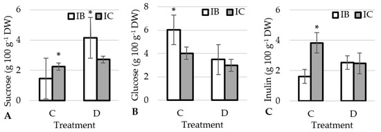 Effect of treatments on sucrose (A), glucose (B) and inulin (C) in garlic ecotypes. *-significant differences (p < 0.05) among the ecotype within each treatment. IB: Istarski bijeli, IC: ‘Istarski crveni’, C: control, D: drought.