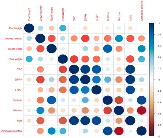 Correlation analysis for morphological characteristics, total phenolic content, antioxidant capacity, sugar, inulin, and amino acid content. Blue and red dots represent positive and negative correlation, respectively. Colour intensities are proportional to the correlation coefficients, as shown in the legend to the right.