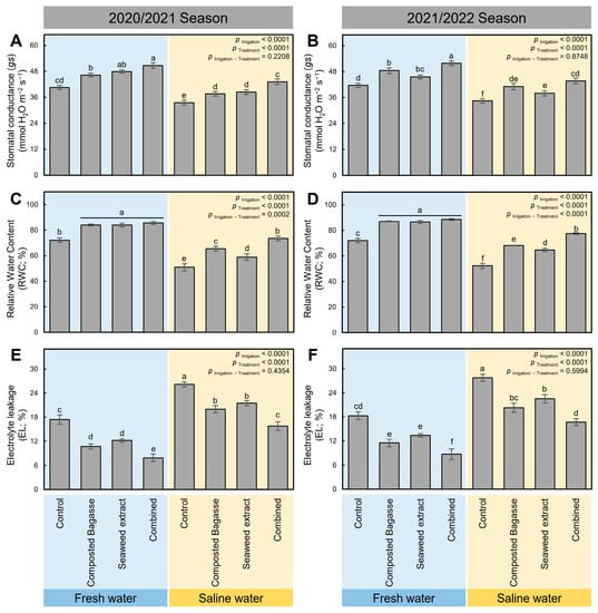 2.3. Composted Bagasse and Cyanobacteria-Based Bio-Stimulants Augmented the Water Relations of Barley Plants under Salinity Stress