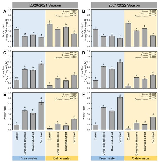 2.6. Composted Bagasse and Cyanobacteria-Based Bio-Stimulants Balanced the Contents of Na+ and K+, and Their Ratio (K+/Na+) in Barley Leaves under Salinity Stress