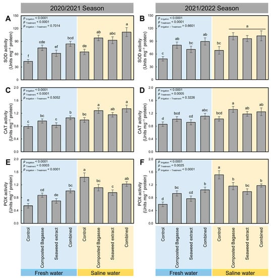 2.8. Application of Composted Bagasse and Cyanobacteria-Based Bio-Stimulants Improved the Activity of Antioxidant Enzymes of Barley Plants under Salinity Stress