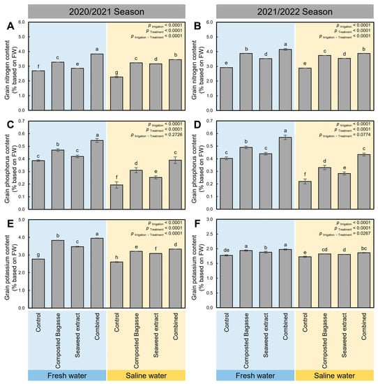 2.10. Application of Composted Bagasse and Cyanobacteria-Based Bio-Stimulants Enhanced the NPK Content of Barley Grains under Salinity Stress