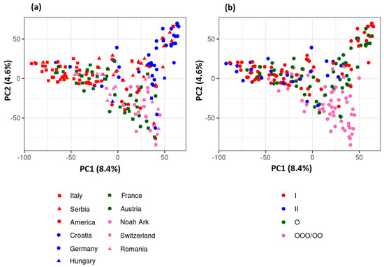 Principal component analysis of 207 cultivars of the European soybean germplasm collection based on (a) country of origin and (b) maturity groups.