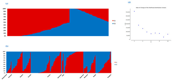 Model-based structure analysis revealed two groups (Q1 and Q2), corresponding to the best-fit K-value of 2 (Figure 2). There were 41 cultivars in Q1 and 75 cultivars in Q2, while 91 were considered admixed according to an 80% affiliation rate. Considering the share of ancestral populations by each country (Figure 2, Table S1), the Italian germplasm was the only one that belonged predominantly to ancestral population 1 with 71.8% cultivars in Q1. The French soybean germplasm originated either from ancestral population Q1 or it was of admixed origin. On the other hand, the Croatian and Swiss cultivars belonged predominantly to ancestral population Q2 (with a proportion of 84.2% and 60.0%, respectively, in group Q2). Most Serbian cultivars originated either from ancestral population Q2 (43.3%) or were of admixed origin (50.0%). Cultivars from Noah’s Ark and American introductions were predominantly of admixed origin. In terms of maturity (Figure 2, Table S1), the highest proportion of cultivars from all groups except MG0 were of admixed origin. However, the proportion of cultivars belonging to Q1 gradually increased (and that of cultivars belonging to Q2 decreased) passing from the earliest (MG000/00) to the latest (MGII) group. For comparison, 1.9% and 50.0% of the cultivars belonged to Q1 and Q2, respectively, in the earliest material (MG000/00), while 43.5% of the cultivars belonged to Q1, and only 8.7% to Q2 in the latest group (MGII).