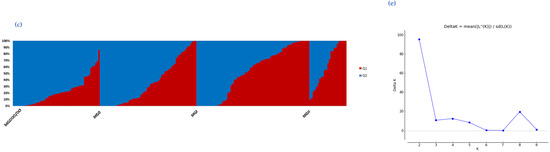 Graphical representation of the proposed structure of the analyzed set of cultivars for k = 2 according to structure analysis. Each cultivar is represented by a vertical column painted in accordance with the Q coefficient and the corresponding source group (a). Cultivars are grouped according to the countries of their origin (b) and maturity groups (c). Rate of change of the likelihood distribution (d) and delta K Evanno method (e) are shown for each possible K.