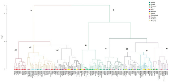 Cluster analysis revealed two main clusters, consistent with the results from structure analysis (Figure 3, Table S2). Cluster A (n = 90) in the dendrogram consisted mainly of Italian cultivars (35/39), French cultivars (15/22), and introductions from America, divided into three subgroups as follows: A1 consisted only of Italian cultivars; A2 mainly of French cultivars and introductions from America; while A3 was dominated by cultivars from Italy, America, and Serbia. The larger cluster B (n = 117) consisted mainly of Croatian, Serbian and Romanian cultivars, followed by Austria, America and Switzerland. Subcluster B1, included mainly Croatian and some Serbian cultivars; B2 was dominated by Central European cultivars from Switzerland and Austria, along with some American cultivars; B3 consisted mainly of Southeastern European cultivars from Romania, Croatia and Serbia; B4 contained mainly Serbian cultivars; B5 contained the majority of Noah’s Ark with some Southeastern European cultivars and two introductions from America. With respect to maturity groups (Figure S1, Table S3), cluster A consisted mainly of cultivars with intermediate or late maturity (MGI, MG0 and MGII), with only eight early cultivars (MG000/00), whereas the larger cluster B consisted mainly of cultivars of MG000/00 (46) and MG0 (40), about half as many cultivars of MGI, and only seven cultivars of MGII. Subcluster B2 consisted almost entirely of MG000/00 cultivars.
