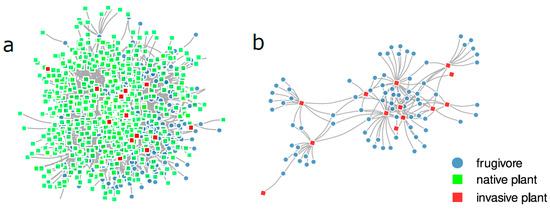 (a) Meta-network which includes all interactions between native and invasive plants and frugivores in the Atlantic Forest biome; (b) Plant–frugivore subnetwork, including only the interactions between involving invasive plant species and frugivores. Each node denotes a species and the links denote interactions between them. Circles denote frugivore species while red squares denote invasive plant species and green squares represent native plant species. These networks were drawn by using the data obtained from the Atlantic Frugivory Dataset [41] after filtering the interactions by the status of plant species (i.e., native and invasive).
