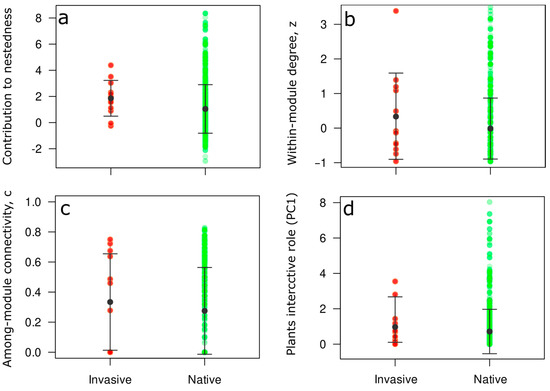 Comparisons between the values of plants’ (a) contributions to nestedness, (b) within-module degree, (c) among-module connectivity, and (d) plants’ interactive roles. The black point denotes the mean for invasive plants and native plants (mean of 500 subsamples), and the lines denote the standard deviation. Each red point denotes an invasive plant species and green points denote the subsampled native plant species.