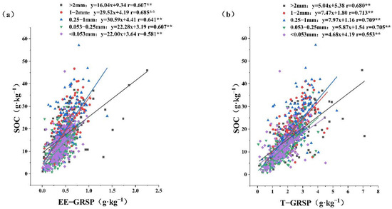 The significant correlations between GRSP (T-GRSP and EE-GRSP) and SOC in each aggregate type are shown in Figure 2 (p < 0.01). The strongest correlation was found in the 1–2 mm aggregate with the highest r value (0.685, 0.713), and the weakest correlation in the <0.053 mm aggregate with the lowest r value (0.581, 0.553). These results suggest that the GRSP content in the aggregates of larger particles promoted SOC storage more than that in the aggregates of smaller particles.