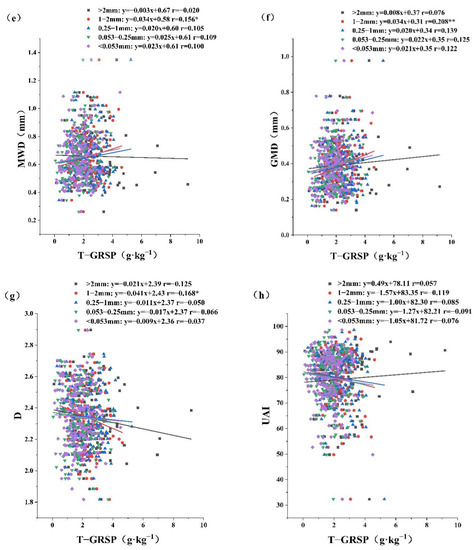 The correlations between GRSP and the different soil aggregate stability indicators are shown in Figure 3. The four aggregates of particles <2 mm showed significant positive correlations between EE-GRSP and MWD and GMD (p < 0.05); the correlation coefficient was the largest for the <0.053 mm particle size (Figure 3a,b). The most significant correlation between EE-GRSP and the D value was found for the 1–2 mm aggregate (p < 0.05) (Figure 3c). The EE-GRSP in the 1–2 mm, 0.053–0.25 mm and <0.053 mm particle size aggregates showed significant negative correlations with UAI (p < 0.05) (Figure 3d). Figure 3e–g showed that T-GRSP in the 1–2 mm aggregate was significantly correlated with MWD, GMD, and D (p < 0.05).