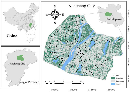 The study area was located in Nanchang City, in the northern part of Jiangxi Province, East China (28°09′–29°11′ N, 115°27′–116°35′ E), with an average elevation of ~30 m. It has a typical subtropical monsoon climate with four distinct seasons, abundant rainfall, and a total area of 7159 km2. Among the different land use patterns, vegetation coverage accounts for 4703.69 km2, or 63.37% of the total area of Nanchang. Impervious surface is the second largest land use type with 1553.68 km2, accounting for 20.93% of the total area, while water and naked land use types account for 13.08% and 2.63%, respectively [31].