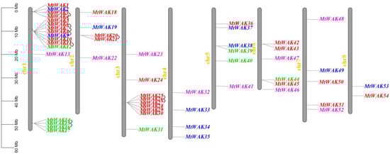 Fifty-four MtWAKs were unevenly distributed on eight chromosomes (Figure 1). Chromosome 1 had 17 MtWAKs, while the other chromosomes had 2 to 9 MtWAKs. Interestingly, 20 MtWAK-RLKs and 7 MtWAK-RLCKs were found in clusters with 10 pairs of tandem duplicated gene pairs, while most MtWAK-RLPs and MtWAK short proteins were separately distributed on 8 chromosomes (Figure 1, Table S2).