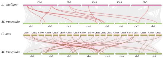 The synteny analysis of MtWAKs between M. truncatula and A. thaliana or G. max. Gray lines indicate all collinear blocks within M. truncatula and A. thaliana or G. max, while red lines indicate the synteny of WAK genes between M. truncatula and A. thaliana or G. max.