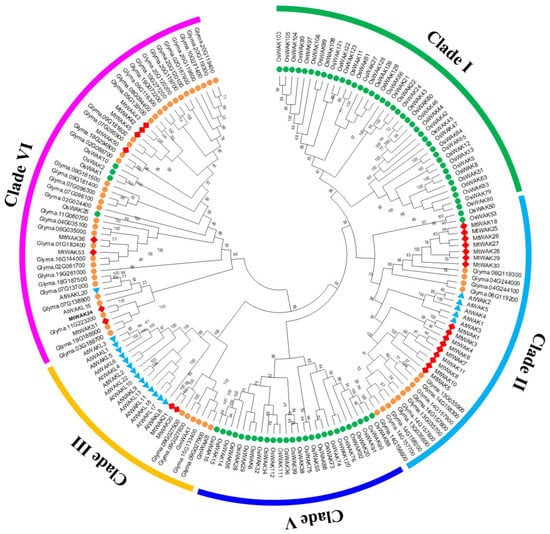 Phylogenetic analysis of WAK-RLKs from M. truncatula, A. thaliana, G. max and O. sativa: 26 MtWAK-RLKs (red square), 21 AtWAK-RLKs (blue triangle), 56 GmWAK-RLKs (orange circle) and 71 OsWAK-RLKs (green circle) were aligned using the CLUSTALX software (Version 1.81). The phylogenetic tree was constructed with MEGAX software (version 10.0.5) by the neighbor-joining methodwith 1000 bootstrap replicates.