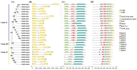 The gene structure, conserved domain and motif analysis of MtWAK-RLKs. (A) The phylogenetic tree of MtWAK-RLKs. (B) The gene structure of MtWAK-RLKs. (C) The conserved domain of MtWAK-RLKs. (D) The top ten conserved motifs of MtWAK-RLKs.