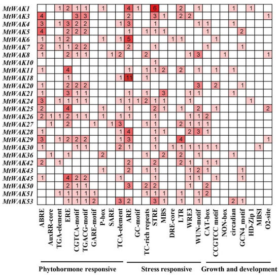 Cis-acting elements in the promoters of MtWAK-RLKs. The numbers and the depth of red represent the frequency of the elements. ABRE, ABA-responsive element; AuxRR-core and TGA-element, auxin-responsive elements; ERE, ethylene-responsive element; CGTCA and TGACG motif, MeJA-responsive elements; SARE and TCA-element, salicylic-acid-responsive elements; GARE-motif and P-box, GA-responsive elements; ARE and GC-motif, anaerobic induction elements; TC-rich repeats and STRE, stress-responsive elements; MBS, drought-induced element; DRE-core, dehydration-responsive element; LTR, low-temperature-responsive element; WRE3 and WUN-motif, wound-responsive element; CAT-box, meristem expression element; CCGTCC motif and NON-box, meristem-specific activation elements; circadian, circadian control element; GCN4_motif, endosperm-expression element; HD-Zip 1, palisade mesophyll cell-expression element; MBS, flavonoid biosynthetic gene regulation element; O2-site, zein metabolism regulation element.