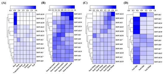 Clustered heatmap of the relative expression levels of MtWAK-RLKs in different tissues and developmental stages. (A) Different organs. (B) Developing seeds. (C) Developing internodes. (D) Developing nodules. Microarray data are normalized by the mean expression value of each gene in tissues. The clustered heatmap on log2 scale is drawn using TBtools software (Version 1.108). DAP, days after pollination. DPI, days post-incubation.